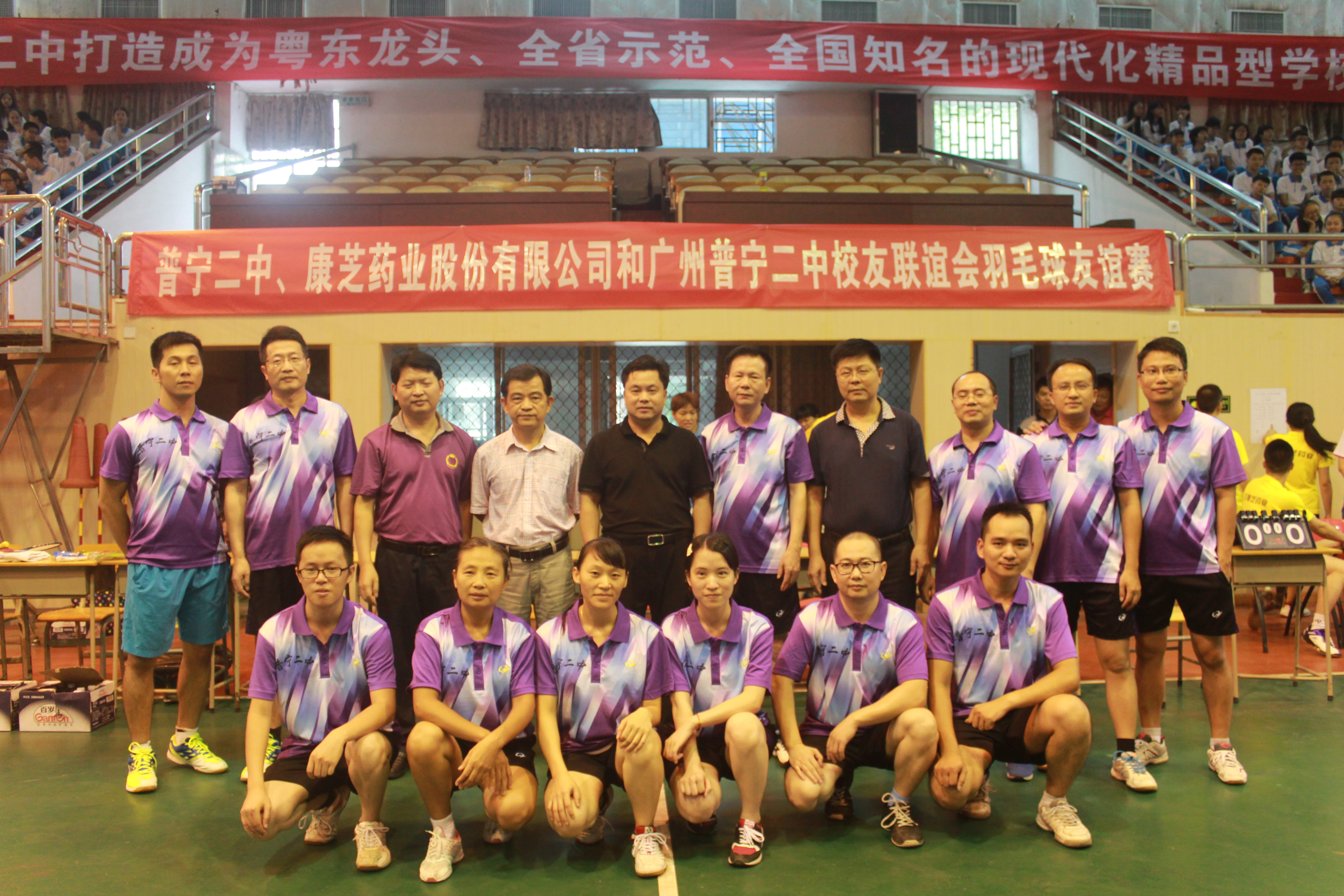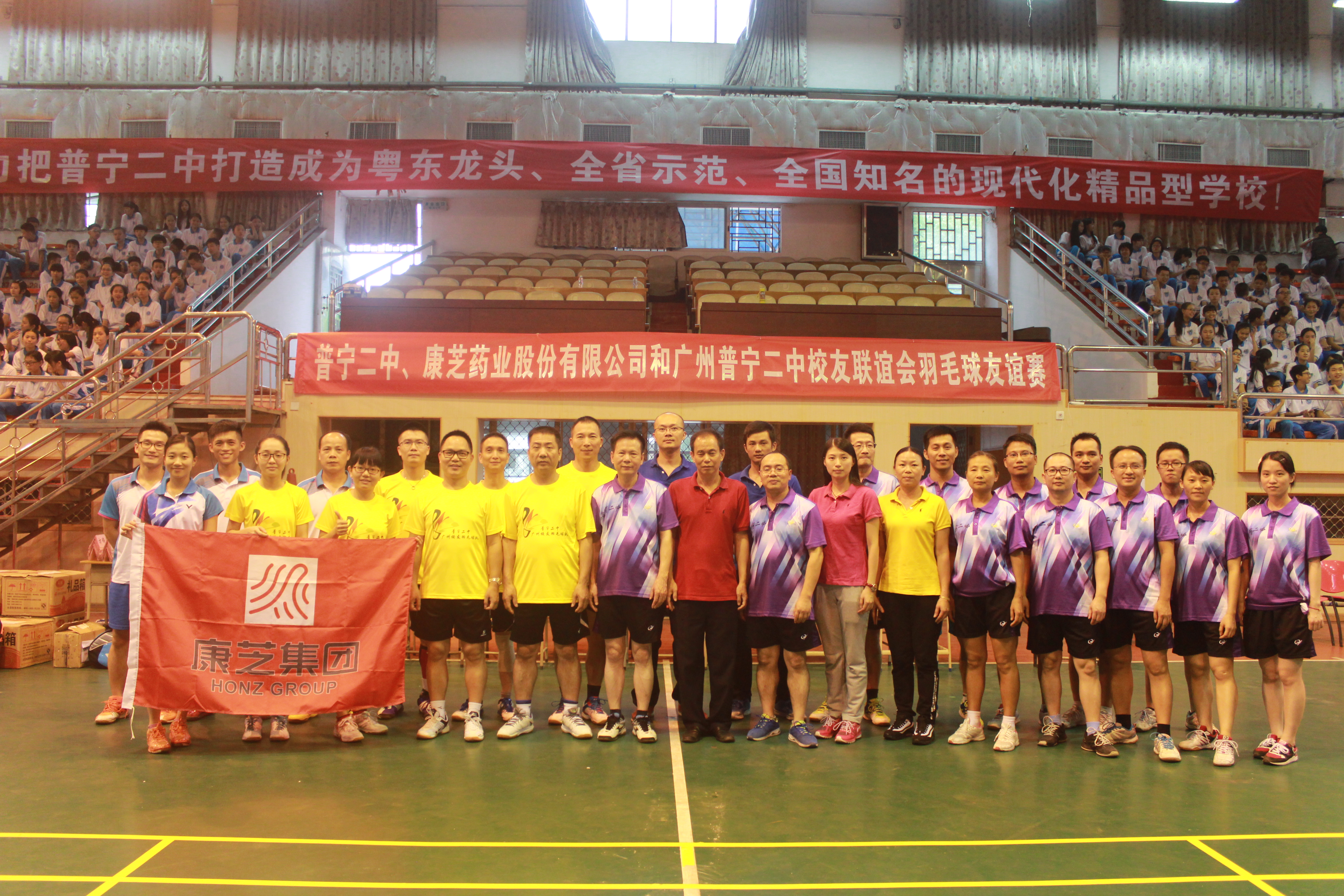 10月8日下午,康芝藥業董事長洪江游先生帶領康芝羽毛球俱樂部成員,風塵仆仆來到其母校普寧二中參加羽毛球友誼賽。當天,以洪江游董事長為首的康芝羽毛球俱樂部,和普寧二中廣州校友聯誼會秘書長羅勇強先生等校友代表組成了聯合代表隊,與普寧二中副校長陳偉旭先生率領的二中代表隊進行了一場精彩對決。