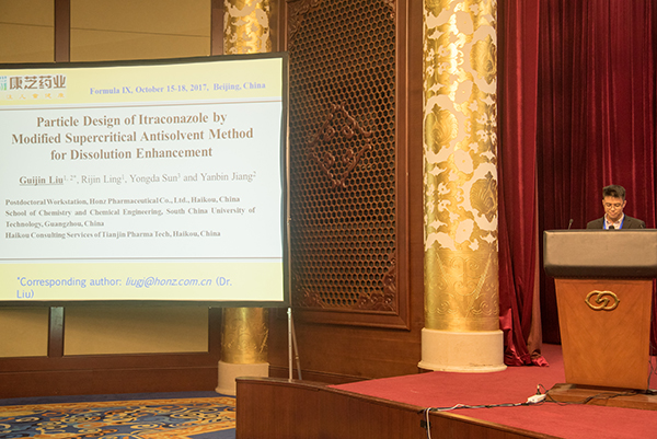 劉貴金博士長期從事與SCF PD技術相關的工作,其博士后研究課題著眼于SCF PD技術在制藥領域的應用,榮獲“中國博士后科學基金第61批面上資助”(資助編號:2017M612663)。目前,基于SCF PD技術創新平臺,康芝藥業已實現伊曲康唑、頭孢地尼和尼美舒利等難溶性藥物的增溶或溶出調控,取得良好的階段性成果,已申請相關發明專利1項,發表高水平SCI論文3篇。此次,劉貴金博士在Formula IX會議上介紹了康芝藥業SCF PD技術創新研究取得的明顯進展,得到了業界專家和參會代表的高度認可,SCF PD技術也引起了諸多參會人員的關注。