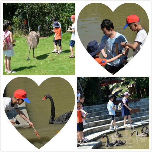 午餐后,大家集體前往南沙水鳥世界。在了解水鳥的形態與生活之余,孩子們還在專人指導下與各色各樣的水鳥展開了親密“交流”。孩子們或手持草料近距離喂食與他們一般高的鴕鳥;或停下匆忙的腳步,閉著眼聆聽湖畔天鵝的鳴叫;抑或伸出手、探出頭,用觸覺和嗅覺代替眼睛來感知面前的小孔雀。