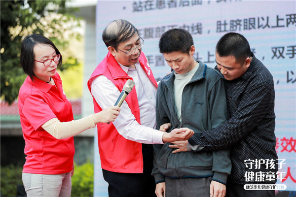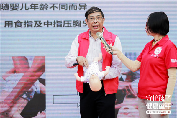 其中,結(jié)合當(dāng)前兒童常見意外情況,丘教授著重給現(xiàn)場孩子家長講解了如何正確應(yīng)對兒童氣道異物梗阻狀況。為了讓現(xiàn)場聽眾更直觀地了解“海姆立克”急救手法,丘教授使用了仿真嬰兒進(jìn)行現(xiàn)場教學(xué),此外,還邀請了兩名家長上臺進(jìn)行真人示范,確保孩子及家長實(shí)際掌握到該急救手法。