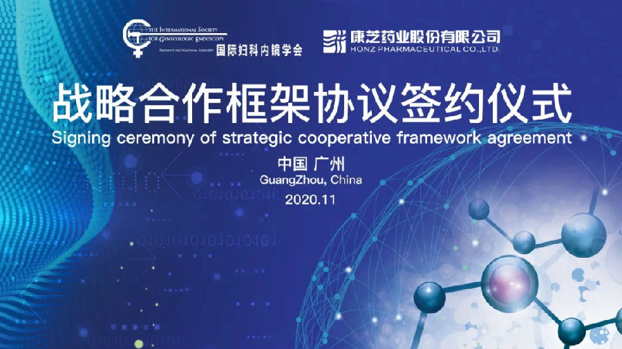 11月23日,康芝藥業股份有限公司國際婦科內鏡學會(ISGE)在康芝廣州總部舉行線上戰略合作簽約儀式。