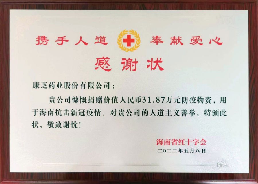 活動(dòng)現(xiàn)場(chǎng),海南省紅十字會(huì)向愛(ài)心企業(yè)康芝藥業(yè)頒發(fā)了感謝狀,以表彰康芝在海南疫情期間積極捐贈(zèng)愛(ài)心防疫物資的人道善舉。