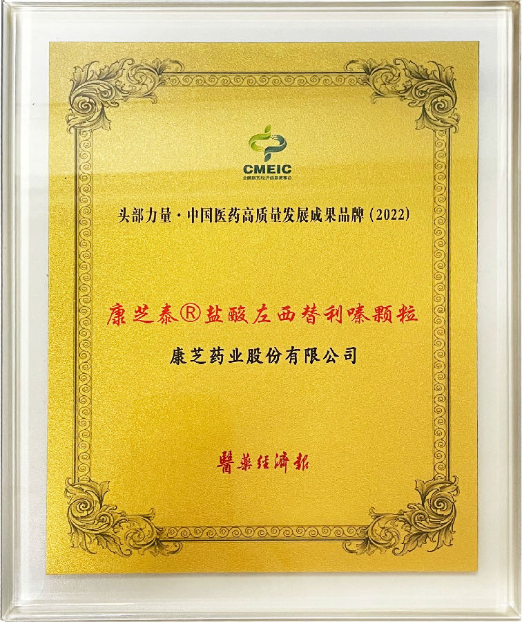 康芝泰·鹽酸左西替利嗪顆粒獲得“頭部力量 中國醫藥高質量發展成果品牌”獎項