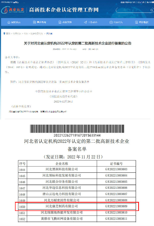 近日,全國(guó)高新技術(shù)企業(yè)認(rèn)定管理工作領(lǐng)導(dǎo)小組辦公室批復(fù)了河北省2022年高新技術(shù)企業(yè)認(rèn)定名單,康芝藥業(yè)旗下子公司河北康芝制藥有限公司憑借著專(zhuān)業(yè)實(shí)力及創(chuàng)新能力,成功通過(guò)河北省“高新技術(shù)企業(yè)”認(rèn)定。