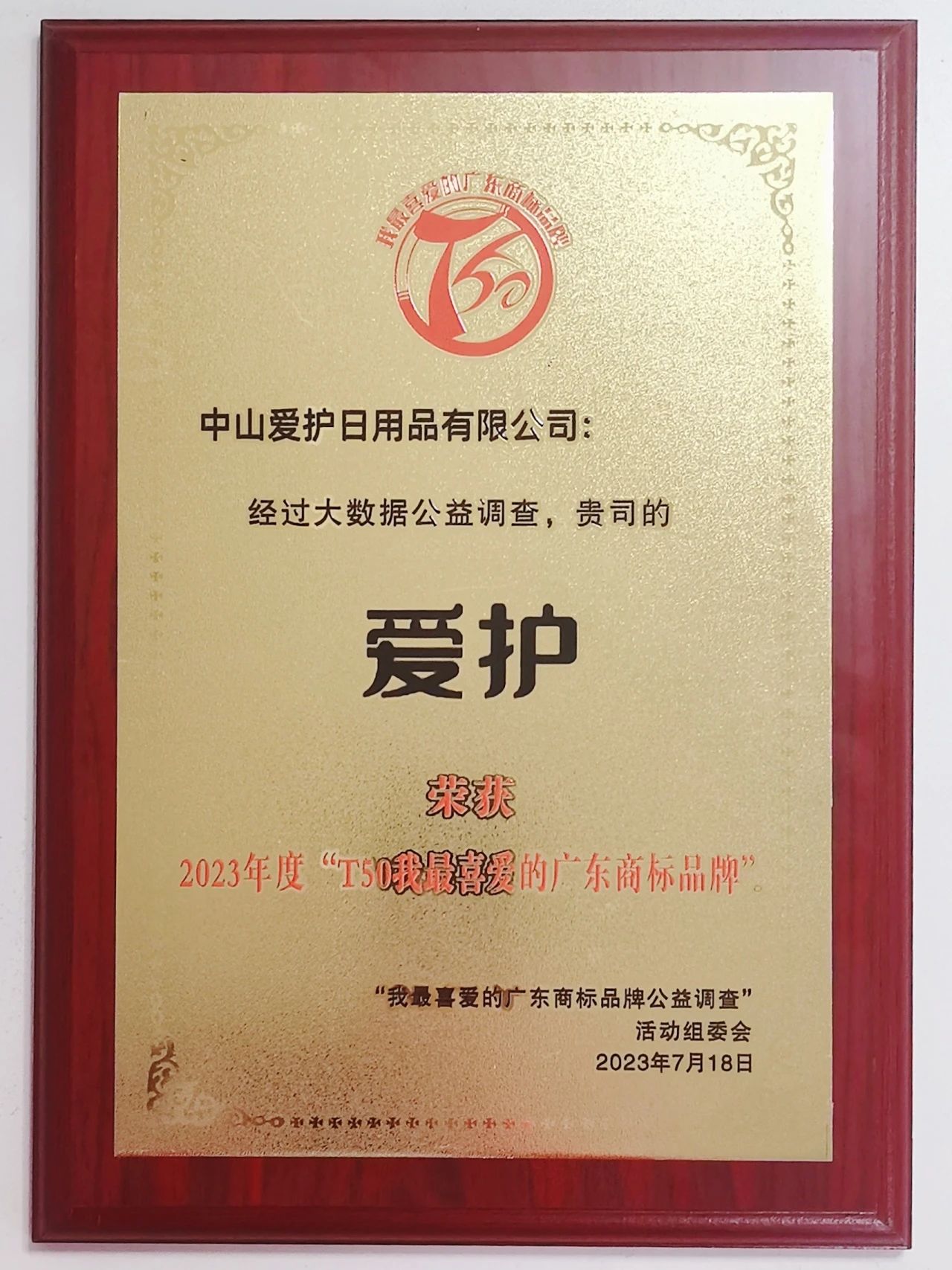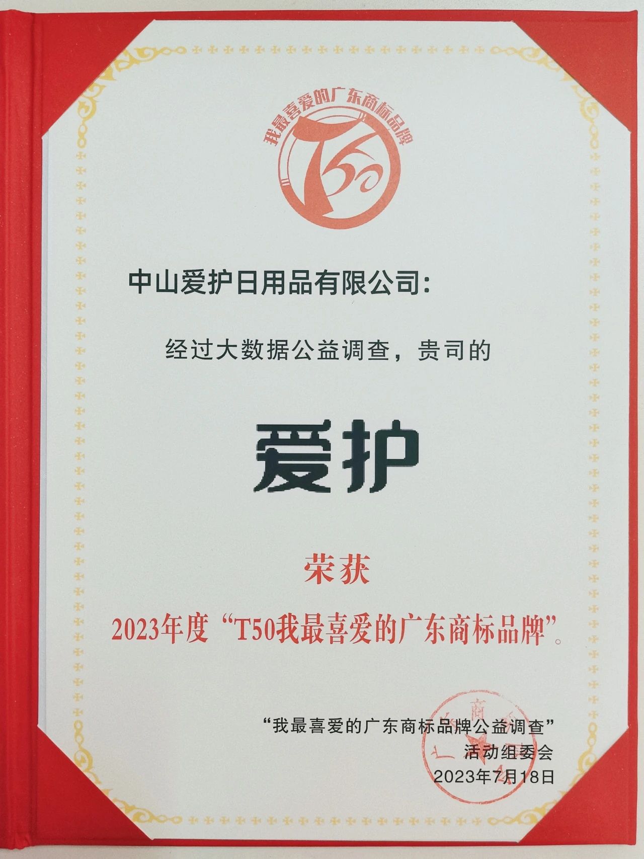 經(jīng)過(guò)大數(shù)據(jù)公益調(diào)查,中山愛(ài)護(hù)日用品有限公司憑借企業(yè)的知名度和美譽(yù)度,“愛(ài)護(hù)”在眾多知名廣東商標(biāo)品牌中脫穎而出,榮獲2023年度“T50我最喜愛(ài)的廣東商標(biāo)品牌”。