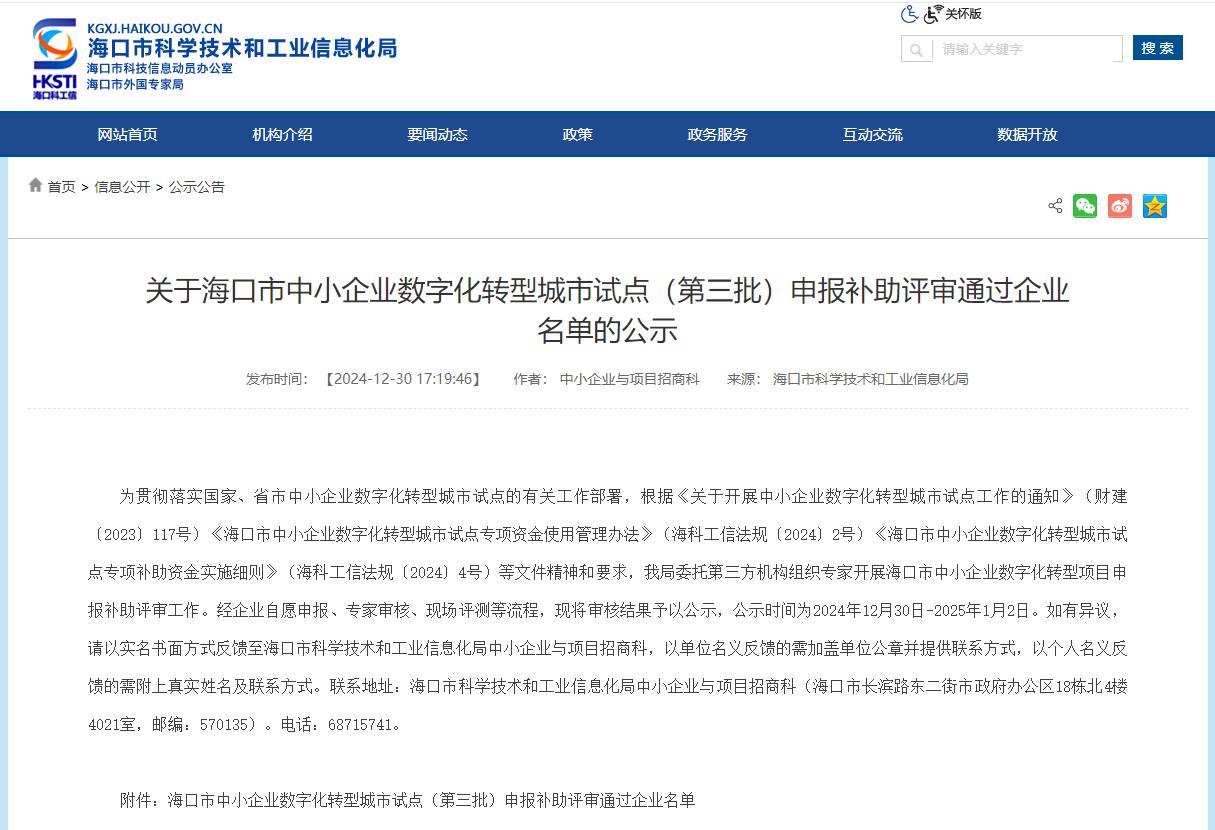 近日,海口市科學技術和工業信息化局正式公布了《海口市中小企業數字化轉型城市試點(第三批)申報補助評審通過企業名單》。經過企業自主申報、專家評審、現場測評等環節,康芝藥業數字化轉型項目成功入選此次通過名單,這標志著康芝藥業數字化轉型工作取得了重要的階段性進展。