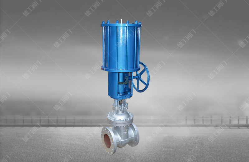 氣動帶手動楔式閘閥是具有氣動執行器(雙層氣缸,并帶有緩沖機構)和手動及其保護機構(手動和可自鎖的氣動-手動轉換裝置)的低支架明桿閘閥。該閥由于采用雙層氣缸結構,其與單氣缸式氣動閘閥相比,提升力增大了一倍。這就從根本上解決了單氣缸氣動閘閥的某些閥體內楔死而打不開的弊病。而且,由于該閥具備緩沖機構,能有效地減速輕了關閉閥門時,由于活塞下行沖擊而造成的閥板車密封面和閥體密封面的磨損,同時,也能避免閘板卡死的現象。